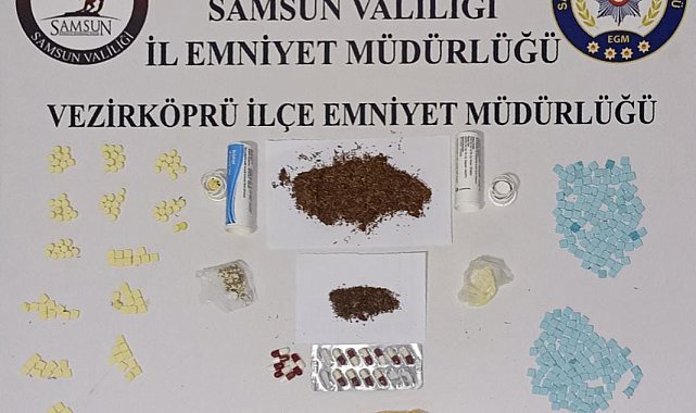 Samsun'un Vezirköprü ilçesinde polis tarafından düzenlenen uyuşturucu operasyonunda 2 kişi gözaltına alındı.Edinilen bilgiye göre, Vezirköprü İlçe Emniyet Müdürlüğü ekipleri tarafından uyuşturucu operasyonu düzenlendi. A.Y. (22) ve H.A. (20) isimli şahısların ikametlerinde ve üzerlerinde yapılan aramalarda uyuşturucu madde ele geçirildi. Aramalarda, 336 adet ecstasy, 17 adet sentetik ecza, 24 gram sentetik kannabinoid, 2 adet peçeteye emdirilmiş bonzai (sentetik kannabinoid) ve 2,52 gram ecstasy tozu ele geçirildi. Olayla ilgili A.Y. ve H.A. gözaltına alındı.Soruşturma devam ediyor.