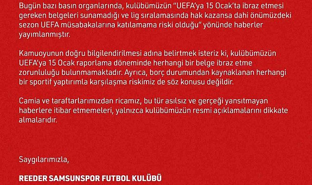 Trendyol Süper Lig ekiplerinden Samsunspor, lig sıralamasında hak kazansa dahi önümüzdeki sezon UEFA müsabakalarına katılamama riski olduğu yönündeki haberlerin gerçeği yansıtmadığını açıkladı.Samsunspor, hakkında çıkan "UEFA'ya 15 Ocak'ta ibraz etmesi gereken belgeleri sunamadığı ve lig sıralamasında hak kazansa dahi önümüzdeki sezon UEFA müsabakalarına katılamama riski olduğu" yönünde çıkan haberler sonrasında açıklama yaptı. Kulüpten yapılan resmi açıklamada şu ifadelere yer verildi:"Bugün bazı basın organlarında, kulübümüzün "UEFA'ya 15 Ocak'ta ibraz etmesi gereken belgeleri sunamadığı ve lig sıralamasında hak kazansa dahi önümüzdeki sezon UEFA müsabakalarına katılamama riski olduğu yönünde haberler yayımlanmıştır. Kamuoyunun doğru bilgilendirilmesi adına belirtmek isteriz ki, kulübümüzün UEFA'ya 15 Ocak raporlama döneminde herhangi bir belge ibraz etme zorunluluğu bulunmamaktadır. Ayrıca, borç durumundan kaynaklanan herhangi bir sportif yaptırımla karşılaşma riskimiz de söz konusu değildir. Camia ve taraftarlarımızdan ricamız, bu tür asılsız ve gerçeği yansıtmayan haberlere itibar etmemeleri, yalnızca kulübümüzün resmi açıklamalarını dikkate almalarıdır."Şu an ligde 3. sırada bulunan Karadeniz temsilcisi, sezonu ilk 5 sıra içerisinde bitirirse, Türkiye'yi Avrupa liglerinde temsil etme hakkı elde edecek.