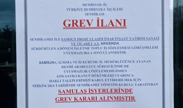 Samsun'da toplu taşıma hizmeti veren SAMULAŞ ile yetkili sendika arasında devam eden toplu iş sözleşmesi görüşmelerinden bir sonuç çıkmayınca grev kararı alındı. İşyerine grev yazısını asan sendika, resmi olarak İŞKUR'a da kararı bildirdi.
