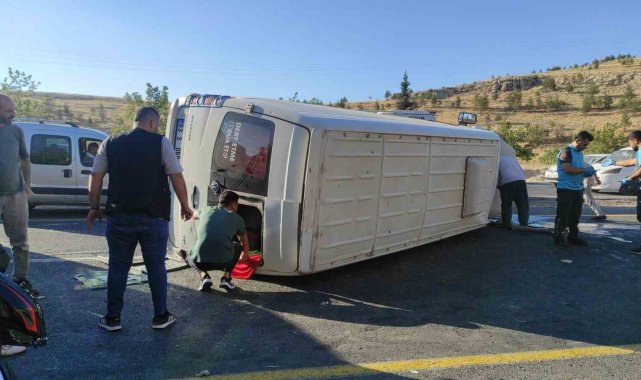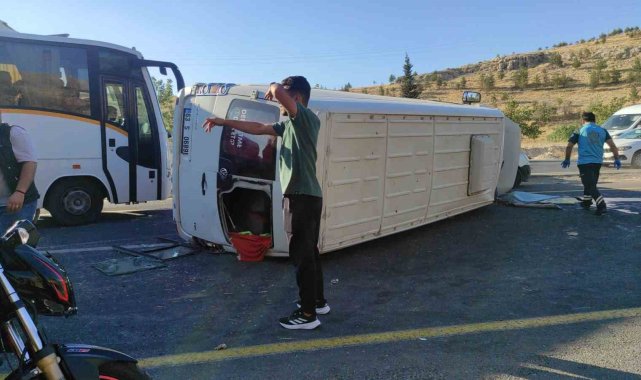 Şanlıurfa'da fabrikada çalışan işçileri taşıyan servis aracının otomobil ile çarpışarak devrildiği trafik kazasında 12 kişi yaralandı.