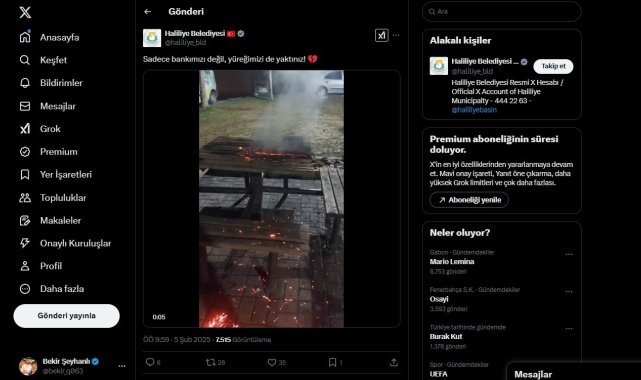 Şanlıurfa'nın Haliliye ilçesinde, parkta bulunan oturma bankı kimliği belirsiz kişilerce ateşe verildi. Belediyenin sosyal medya hesabından yapılan paylaşımda, "Sadece bankımızı değil, yüreğimizi de yaktınız" denildi.
