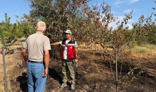 Şaphane'de meyve bahçesindeki yangın sonrası hasar tespit çalışması