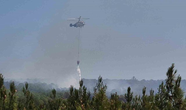 Tekirdağ'ın Şarköy ilçesi Kızılcaterzi Mahallesi yakınlarında çıkan orman yangınına, havadan helikopter desteğiyle müdahale ediliyor.Şarköy ilçesindeki ormanlık alanda henüz bilinmeyen nedenle yangın çıktı. Alevlerin kısa sürede yayılması üzerine bölgeye çok sayıda ekip sevk edildi. Yangına itfaiyelerin yanı sıra yangın söndürme helikopteri de müdahale ediyor. Helikopter art arda sortiler yaparak yangının yoğun olduğu bölgelere su boşaltıyor. Havadan yapılan müdahalelerin yanı sıra karadan da ekipler alevlerin yayılmasını önlemeye çalışıyor.Yangının kontrol altına alınması için çalışmalar aralıksız devam ederken, yetkililer vatandaşları yangın bölgesine yaklaşmamaları konusunda uyardı. Yangının çıkış nedeni araştırılıyor.