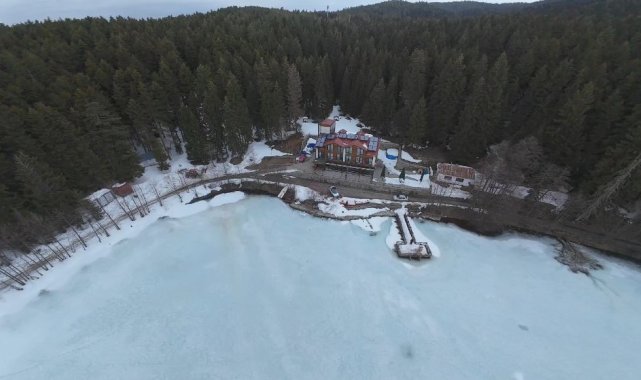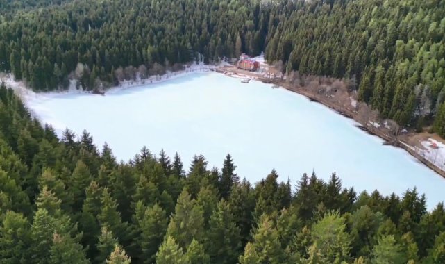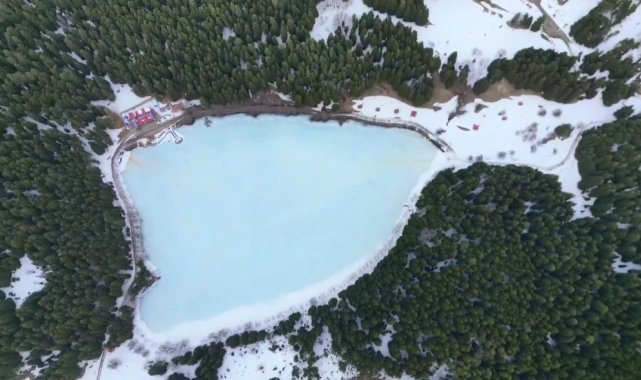 Artvin'in Şavşat ilçesindeki Karagöl'ün, havaların ısınmasıyla birlikte kar ve buzla kaplı yüzeyi erimeye başladı. Ormanın yeşile, gölün beyaza bürünmüş hali kartpostallık görüntüler sunuyor.Artvin´in "Sakin Şehir" ünvanlı Şavşat ilçesinde doğal güzellikleriyle ünlü Karagöl, ziyaretçilerine muhteşem bir manzara sunuyor. Kalp şeklini andıran görünümü, buz tutan göl beyaza bürünürken adeta masal diyarlarını andırıyor.İlçe merkezine 25 kilometre uzaklıkta bulunan ve kuş bakışı görüntüsü kalbi andıran Karagöl, şehirden uzak doğayla iç içe zaman geçirmek isteyen turistlerin ilgisini çekiyor. Sahara Milli Parkı içerisinde bulunan ladin ve çam ağaçları arasında kalp şeklindeki görüntüsü ile dikkat çeken Karagöl, dron kamerası ile havadan görüntülendi.