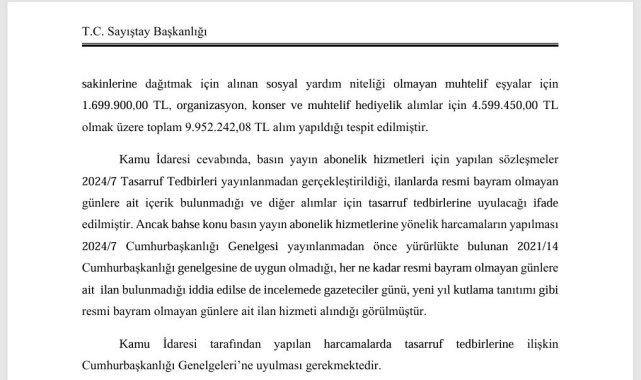 Sayıştay'ın 2024 yılı denetim raporuna göre Altınordu Belediyesi, Cumhurbaşkanlığı'nın tasarruf genelgelerine aykırı şekilde 9 milyon 952 bin TL tutarında harcama yaptı.