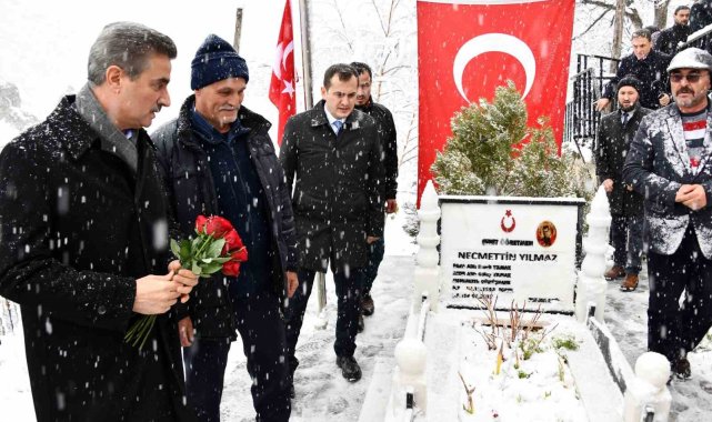 Gümüşhaneli şehit öğretmen Necmettin Yılmaz, Öğretmenler Günü'nde Torul ilçesi Demirkapı köyünde bulunan kabri başında düzenlenen programla anıldı.Yoğun kar yağışı altında gerçekleşen programda Vali Aydın Baruş, protokol üyeleri ve şehit öğretmenin aile bireylerinin kabre gül bırakmasının ardından Kur'an-ı Kerim okunarak, dua edildi. Şehit öğretmenin babası Hamit, annesi Gülay, kardeşleri Ahmet ve Yahya Yılmaz'ın da katıldığı programda konuşan Vali Baruş, "24 Kasım Öğretmenler Günü'nde bu büyük milletin birer evladı olarak vefa ve minnet borcumuzu ifa etmek üzere Gümüşhane'mizin Torul ilçesine bağlı Demirkapı köyünde bulunan kabristanına geldik. Burada Necmettin Yılmaz şehidimiz yatıyor. Şehadetiyle tüm öğretmenlerimize ışık olmuş, yol göstermiş ve millet için fedakarlığın ne anlama geldiğini şehadetiyle göstermiş olan çok kıymetli bir vatan evladının kabrindeyiz. Allah rahmet eylesin, mekanı âli olsun, makamı cennet olsun" dedi.Öğretmenlerin toplumun geleceğine hizmet eden, emekleriyle insan kaynağını inşa eden neferler olduğunu vurgulayan Vali Baruş, "Milletler bağımsızlıklarını ve hür yaşamalarını, maddi ve manevi kalkınmalarını insan kaynağına borçludur. Bu insan kaynağını yetiştiren, inşa eden meslek sahipleri de öğretmenlerdir. Bu anlamda öğretmenlerimizin milletimizin ve ülkemizin geleceğinin inşasındaki rolleri yadsınamaz. Bu mesleği ifa ederken büyük bir fedakarlıkla çalışmak lazım. Milletine hizmet aşkıyla görevini ifa etmek lazım. Necmettin Yılmaz evladımız da bu öğretmenlerimizden birisiydi. 2016 yılında büyük bir aşkla ve şevkle milletine hizmet etmek için mesleğine atılmış. 2016 senesinde Şanlıurfa'nın Siverek ilçesinde Çiftçibaşı köyüne sınıf öğretmeni olarak atanmıştı. Ve büyük bir azimle çalışıyordu. 2017 yılında memleketi olan Gümüşhane'ye dönerken Tunceli Pülümür'de bölücü terör örgütüne mensup teröristlerce yolu kesilerek şehit edildi. Ve o günden bugüne öğretmenlik mesleğinin, eğitim camiamızın bir simgesi oldu" diye konuştu."Biz Necmettin evladımız gibi şehitlerimizin fedakarlığı sayesinde bugünlere geldik" ifadelerini kullanan Vali Baruş, "Ülkemizin geleceği de onların gösterdiği şehadet yolunda, fedakarlık yolunda inşa ediliyor. Bugün bizlerin yetişmesinde büyük emeği olan ve üzerimizde her birinin hakkı yadsınamaz olan tüm öğretmenlerimizin öğretmenler gününü bir kez daha tebrik ediyoruz. Necmettin Yılmaz şehidimiz nezdinde tüm şehadete eren öğretmenlerimizin minnet ve şükranına yad ediyoruz. Ve başöğretmen Gazi Mustafa Kemal Atatürk olmak üzere eğitim camiasına hizmet etmiş, bu uğurda ömürlerini tüketmiş, Allah'ın rahmetine ulaşmış tüm öğretmenlerimizi de bir kez daha rahmetle anıyoruz. Onların gösterdiği yol bize rehber olacaktır. Bu rehberlik sayesinde de yeni yetişen öğretmenlerimiz ülkemizin geleceğini inşa etmek üzere memleketimizin dört bir köşesinde hiçbir şeyden çekinmeden, hiçbir tehdide boyun eğmeden aşkla ve şevkle hizmet etmeye devam edecektir. Şehidimizi bir kez daha anarken yanımızda bulunan ailesinin acılarını bir kez daha paylaşıyoruz" dedi.Şehit öğretmenin kardeşi Ahmet Yılmaz, "Necmettin Yılmaz, vatanına devletine bağlı bir öğretmendi. Görevini en iyi şekilde yerine getirmek için canla başla çalışıyordu. Bugün buraya gelen herkese teşekkür ediyorum" ifadelerini kullandı.Yaz tatilini geçirmek için 16 Haziran 2017 günü görev yeri Şanlıurfa'nın Siverek ilçesi Çiftçibaşı İlkokulundan memleketi Gümüşhane'nin Torul ilçesine dönerken PKK terör örgütü mensupları tarafından Tunceli-Erzincan karayolu Pülümür ilçesi civarında aracı yakıldıktan sonra kaçırılarak şehit edilen ve bölgede 27 gün süren arama çalışmalarının ardından cansız bedeni 12 Temmuz 2017'de Pülümür Çayı'nda bulunan 8 aylık sınıf öğretmeni 24 yaşındaki Necmettin Yılmaz, 16 Temmuz 2017 tarihinde ilçeye bağlı Demirkapı köyünde son yolculuğuna uğurlanmıştı.