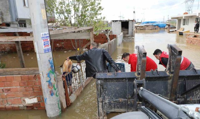 Şehzadeler Belediyesi ekipleri, etkili yağışların ardından su taşkını yaşanan Akpınar Mahallesi'nde evlerinden çıkamayan vatandaşlara iş makineleriyle ulaşarak temel ihtiyaç malzemesi dağıttı.Manisa'da son günlerde etkili olan yoğun yağışlar, Şehzadeler ilçesindeki Akpınar Mahallesi'nde su taşkınlarına neden oldu. Yükselen su seviyesi nedeniyle bazı yurttaşlar evlerinde mahsur kalırken, Şehzadeler Belediyesi Sosyal Yardım İşleri Müdürlüğü ekipleri hızlı bir şekilde bölgeye sevk edildi.Yaşanan olumsuzluklara kayıtsız kalmayan Şehzadeler Belediyesi ekipleri, iş makineleri yardımıyla suyla kaplanan sokaklara girerek mahsur kalan vatandaşlara ulaştı. Ekipler tarafından bölgedeki ailelere ekmek ve su başta olmak üzere temel gıda ürünleri dağıtıldı.