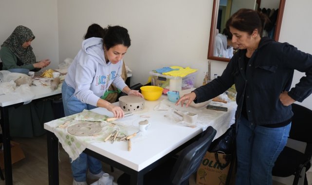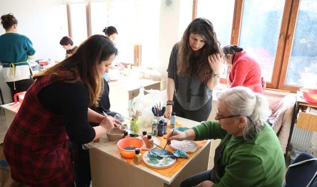 Kartepe'de ev hanımlarının yoğun ilgi gösterdiği seramik kursunda, uzman eğitmenler eşliğinde üretilen eserler göz dolduruyor.