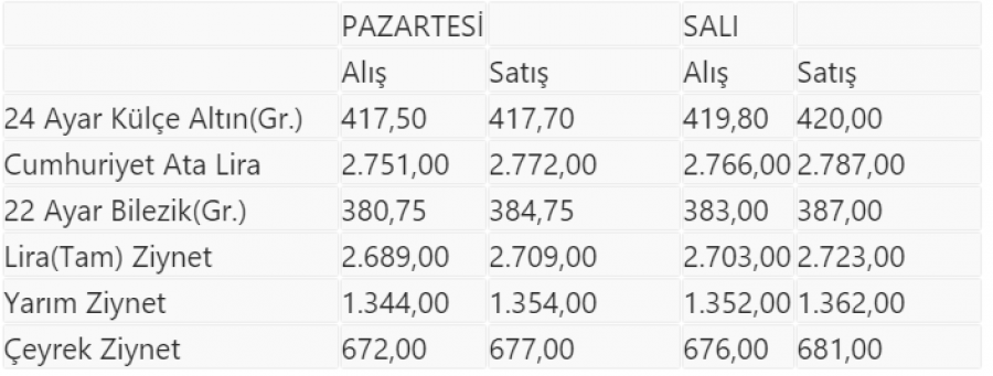 İstanbul Kapalıçarşı'da, bugün kapanışta çeyrek altın 681,00 lira, Cumhuriyet altını 2.787,00 liradan satılırken, 24 ayar külçe altının gram fiyatı ise dünkü kapanışa göre yüzde 0,55 yükselişle 420,00 liradan işlem gördü.İstanbul Kapalıçarşı'da alınıp satılan altın türlerinin, önceki ve bugün itibarıyla kapanış fiyatları (TL) şöyle: