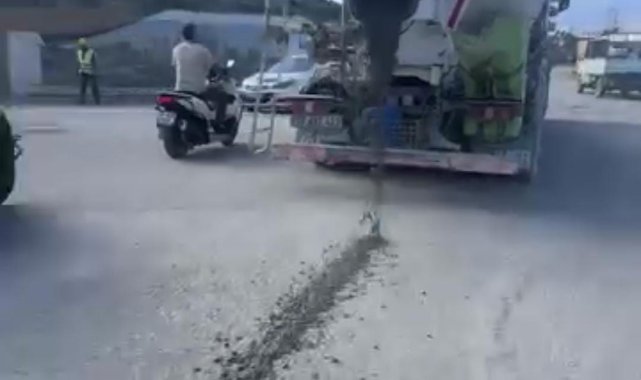 Seyir halindeki mikserin yola beton döktüğü anlar kamerada