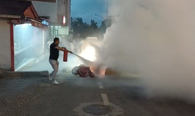 Samsun'da seyir halindeyken alev alev yanan motosikletten sürücü kaçarak kurtulurken, o anlar anbean kameralara yansıdı.Olay, İlkadım ilçesi Anadolu Mahallesi Barış Bulvarı üzerinde meydana geldi. Edinilen bilgiye göre, kurye Murat K.'nin idaresindeki motosiklet seyir halindeyken alev aldı. Yangını fark eden vatandaşların ikazı üzerine sürücü aracı bırakıp panikle kaçtı. Vatandaşlar yangın söndürme tüpü ile araca müdahale edip yangını söndürdü. Olay anı anbean güvenlik kamerasına yansıdı. Olay yerine gelen itfaiye ekipleri ise soğutma çalışması yaptı. Polis olayla ilgili inceleme başlattı.