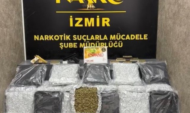 İzmir'in Konak ilçesinde seyyar pazarcılık yaptığı öğrenilen bir kişiye ait olduğu öğrenilen hediye paketlerinin içerisinde, 39 kilo 600 gram skunk esrar maddesi ele geçirildi. Olayla ilgili gözaltına alınan şüpheli tutuklandı.İzmir Narkotik Suçlarla Mücadele Şube Müdürlüğü ekipleri, İzmir Cumhuriyet Başsavcılığı koordinesinde yürüttükleri çalışmada, Konak ilçesinde bir iş yerinde uyuşturucu madde bulunduğu bilgisi üzerine harekete geçti. Belirlenen iş yeri adresi ve bir araçta yapılan aramalarda, seyyar pazarcılık yaptığı öğrenilen Y.E.'ye ait 39 kilo 600 gram skunk esrar maddesi ile 2 adet tabanca ve 730 adet tabanca fişeği ele geçirildi.Hediye paketlerinden uyuşturucu, boks eldiveninden silah çıktıÖte yandan, yapılan aramada, uyuşturucu maddelerin hediye paketi görünümlü poşetlere gizlendiği görüldü. Şüpheliye ait tabancaların ise, boks eldiveni içerisine gizlendiği öğrenildi. Olayla ilgili gözaltına alınan Y.E., emniyetteki işlemlerin ardından sevk edildiği mahkemece tutuklandı. Operasyon kapsamında gözaltına alınan S.E. ise, adli kontrol şartıyla serbest kaldı.