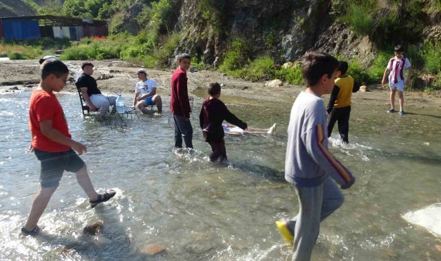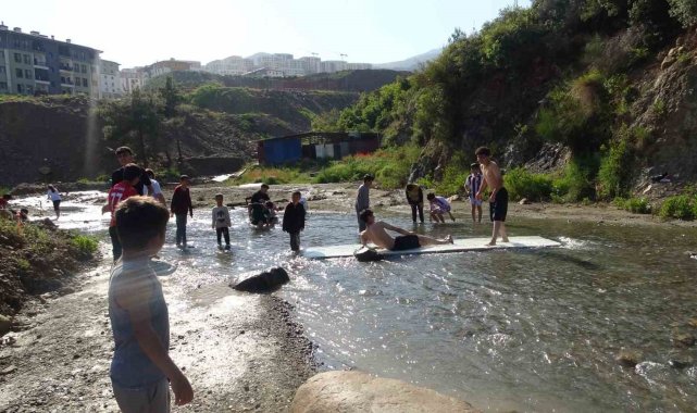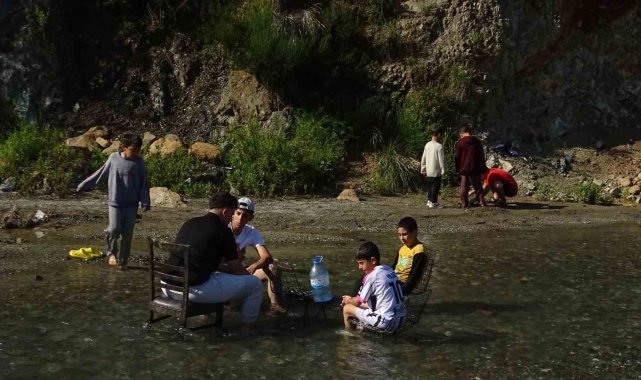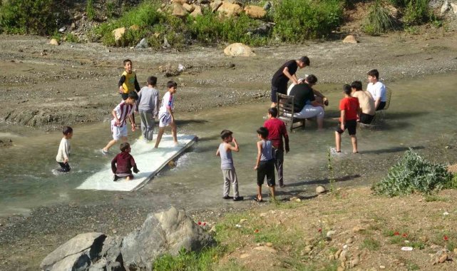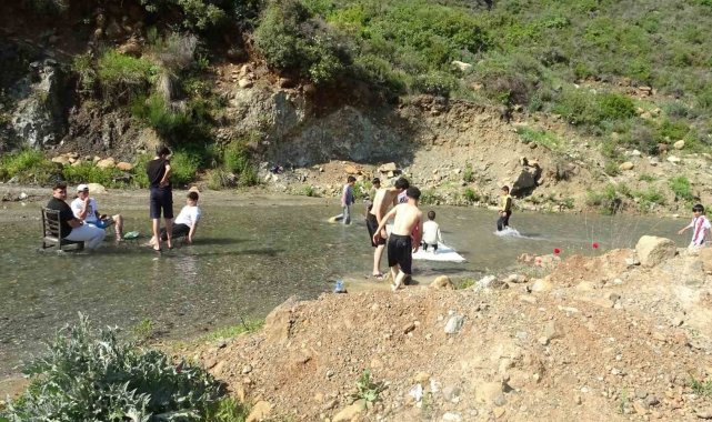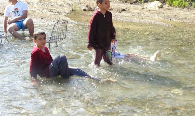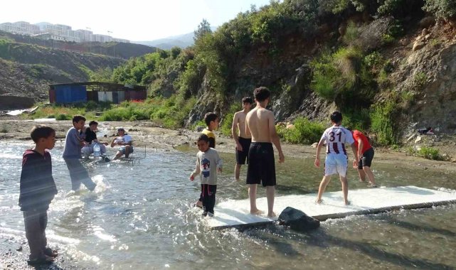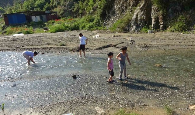 Hatay'da sıcak havadan bunalarak serinlemek isteyen çocuklar, derede yüzdüler.