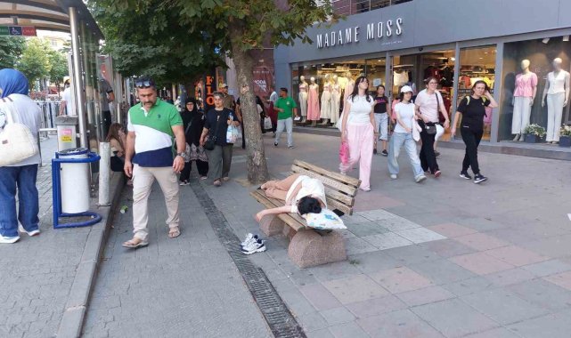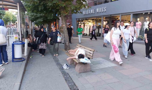 Eskişehir'de sıcaktan bunalan bir gencin şehrin en işlek caddesi üzerindeki bir bankta uzanıp uyuması ilginç bir görüntü oluşturdu.