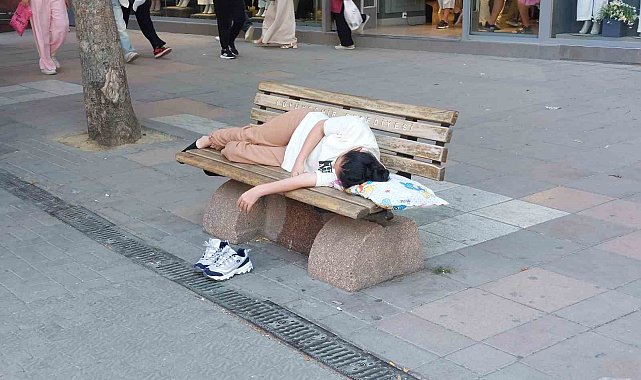 Eskişehir'de sıcaktan bunalan bir gencin şehrin en işlek caddesi üzerindeki bir bankta uzanıp uyuması ilginç bir görüntü oluşturdu.Sıcaklık derecelerin yükselmesiyle beraber bunalan insanlar serinlemenin, dinlenmenin farklı yöntemlerini deniyor. Bir genç, 2 Eylül caddesi üzerindeki tramvay durağı arkasında bulunan bankta kafasının altına yastığını koyup uyudu. Çevreden geçen vatandaşlar bu durumu hayretle karşılarken, banktan uzak noktalardan geçip uyuyan genci rahatsız etmemeye çalışması dikkati çekti.