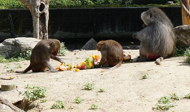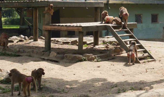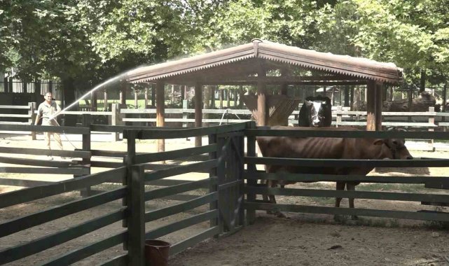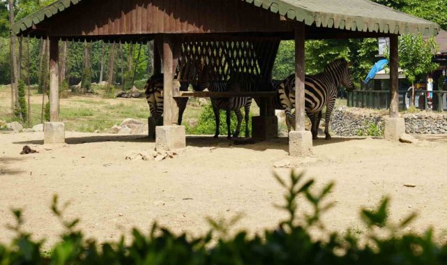Bursa Büyükşehir Belediyesi Hayvanat Bahçesi'nde hayvanlar, 40 dereceyi bulan sıcaklarda buzlu meyve ve sebzelerle serinliyor.Tüm Türkiye'de olduğu gibi Bursa'da da mevsim normallerinin üstünde seyreden sıcak havalar vatandaşları bunalttığı gibi hayvanları da olumsuz etkiliyor. Hava sıcaklığının 40 dereceleri gördüğü, hissedilenin ise 45 dereceyi bulduğu bugünlerde Bursa Hayvanat Bahçesi'nde de hummalı bir çalışma var. Hayvanların sıcaktan etkilenmemesi için ellerinden geleni yapan çalışanlar, hayvanları buzlu meyve ve sebzelerle serinletmeye çalışıyor.Hayvanat bahçesi çalışanları, inek, eşek, deve, at gibi hayvanları hortumlarla serinletmeye çalışırken, bazı hayvanları ise çeşitli sebze ve meyvelerden oluşan buzlu karışımla serinletmeye çalıştı. Bakıcıları tarafından özenle hazırlanan kokteyller için birbiriyle yarışan maymunlar, sıcak havada serinlemenin keyfini çıkardı.Hayvanat bahçesindeki diğer hayvanların bazıları sıcaktan korunmak için sürekli gölge alanları seçerken, beyaz gergedanların ise çamurlu su birikintisine girerek serinlemeye çalışması dikkat çekti.Meteoroloji yetkilileri, hava sıcaklığının hafta boyunca yüksek seyretmesinin beklendiğini hatırlatırken, dikkatli olunması konusunda da uyardı.