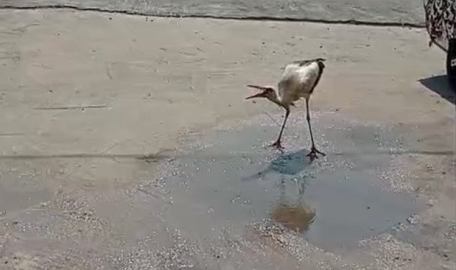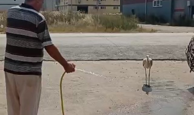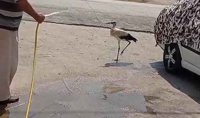 Sıcaktan bunalan leyleği hortumla serinletti