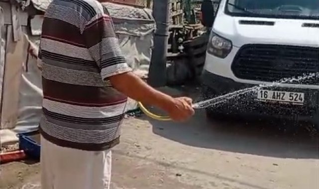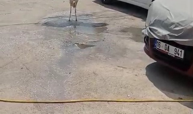 Bursa'nın İnegöl ilçesinde sıcak havalardan bunalan bir leylek, bir evin önüne inerek gölgeye sığındı. Ev sahibi ise durumu fark edince hortumla leyleği ıslatarak serinletti.