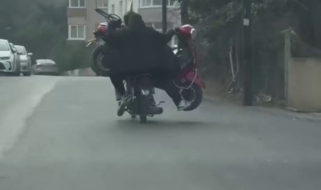 Şile'de motosikletle seyir halinde olan 2 kişi, bindikleri motosikletin üzerine başka bir motosiklet yükleyerek yolculuk yaptı. O anları kaydeden vatandaşlar, gördükleri manzara karşısında kahkahalarını tutamadı.