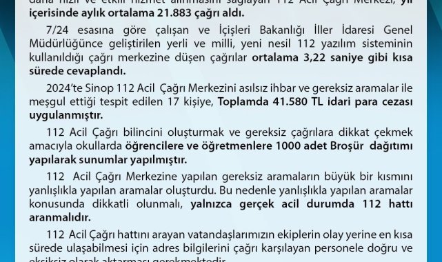 Sinop'ta 112 Acil Çağrı Merkezi'ni gereksiz yere arayarak meşgul eden 17 kişiye 41 bin 580 TL lira para cezası uygulandı.Sinop 112 Acil Çağrı Merkezi'nin 2024 verileri açıklandı. Sinop 112 Acil Çağrı Merkezi Müdürlüğü, 2024 yılında 262 bin 597 adet çağrıya yanıt verdi. Sağlık, itfaiye, emniyet, jandarma, AFAD, orman yangını ve sahil güvenlik ihbarlarını tek bir numara altına toplayarak vatandaşların acil durumlarda daha hızlı ve etkili hizmet alınmasını sağlayan 112 Acil Çağrı Merkezi, yıl içerisinde aylık ortalama 21 bin 883 çağrı aldı.7/24 esasına göre çalışan ve İçişleri Bakanlığı İller İdaresi Genel Müdürlüğünce geliştirilen yerli ve milli, yeni nesil 112 yazılım sisteminin kullanıldığı çağrı merkezine düşen çağrılar ortalama 3,22 saniye gibi kısa sürede cevaplandı. 2024'te Sinop 112 Acil Çağrı Merkezi'ni asılsız ihbar ve gereksiz aramalar ile meşgul ettiği tespit edilen 17 kişiye, toplamda 41 bin 580 TL idari para cezası uygulandı. 2024 yılında, 112 Acil Çağrı bilincini oluşturmak ve gereksiz çağrılara dikkat çekmek amacıyla okullarda öğrencilere ve öğretmenlere bin adet broşür dağıtımı yapılarak sunumlar yapıldı. 112 Acil Çağrı Merkezi'ne yapılan gereksiz aramaların büyük bir kısmını yanlışlıkla yapılan aramalar oluşturdu. Bu nedenle yanlışlıkla yapılan aramalar konusunda vatandaşlardan daha dikkatli olunmaları istenirken, yalnızca gerçek acil durumda 112 hattının aranması talep edildi. Açıklamada, "112 Acil Çağrı hattını arayan vatandaşların ekiplerin olay yerine en kısa sürede ulaşabilmesi için adres bilgilerini çağrı karşılayan personele doğru ve eksiksiz olarak aktarması gerekmektedir. Telefon, SMS, E-call (uyumlaştırılmış araç içi acil çağrı sistemi), Engelsiz 112 uygulaması, ihbar.ng112 web adresi üzerinden de acil çağrı merkezine ihbarda bulunulabileceği unutulmamalıdır" denildi.