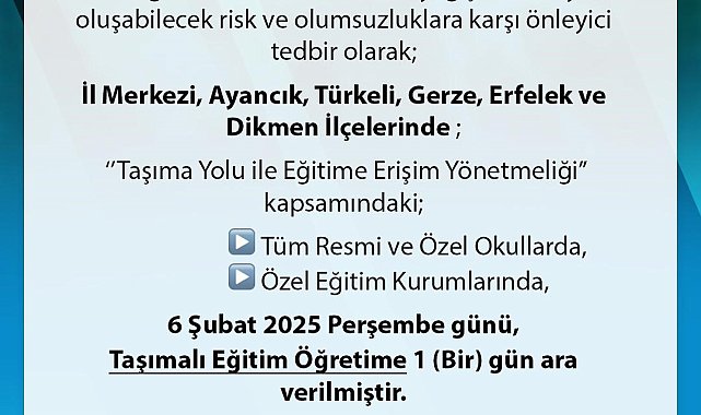Sinop'ta olumsuz hava şartları nedeniyle taşımalı eğitime 06 Ocak Perşembe günü 1 gün süre ile ara verildi.Sinop genelinde etkili olan kar yağışı nedeniyle, oluşabilecek risk ve olumsuzluklara karşı önleyici tedbir olarak; 06 Şubat Perşembe günü, Taşımalı Eğitim Öğretime 1 gün ara verildi.Sinop Valiliği'nden yapılan açıklamada, ''İlimiz genelinde etkili olan kar yağışı nedeniyle, oluşabilecek risk ve olumsuzluklara karşı önleyici tedbir olarak; il merkezi, Ayancık, Türkeli, Gerze, Erfelek ve Dikmen ilçelerinde; 'Taşıma Yolu ile Eğitime Erişim Yönetmeliği' kapsamındaki; tüm resmi ve özel okullarda, özel eğitim kurumlarında, 06 Şubat 2025 Perşembe günü, taşımalı eğitim- öğretime 1 gün ara verilmiştir'' ifadelerine yer verildi.