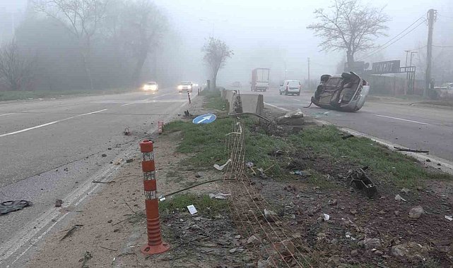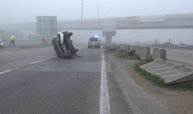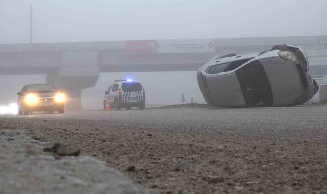 Bursa'da yoğun sis sebebiyle görüş mesafesi kaybolan sürücü, refüjdeki beton bariyere çarptıktan sonra takla attı. Sürücü, yaralı olarak hastaneye kaldırıldı.