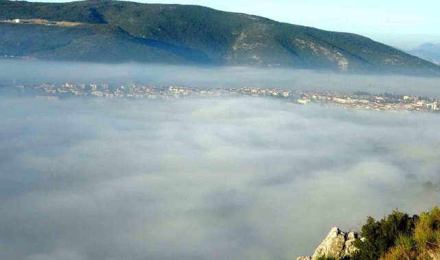 Muğla'nın Menteşe ilçesi, sabah saatlerinde etkili olan yoğun sisle adeta masalsı bir atmosfere büründü. Doğal güzelliklerin üzerini bembeyaz bir örtü gibi kaplayan sis bulutu, kenti tabloyu andıran manzaralarla süsledi.Özellikle yüksek noktalardan bakıldığında sis denizi içinde kaybolan Menteşe, fotoğraf tutkunlarını ve doğa severleri mest etti. Vatandaşlar, bu etkileyici doğa olayını fotoğraflayabilmek için Seyir Tepesi ve diğer yüksek bölgelere akın etti.Meteoroloji yetkilileri, gece boyunca etkili olan soğuk hava ve yüksek nem oranının sis oluşumuna neden olduğunu belirtti.