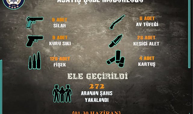 Sivas İl Emniyet Müdürlüğü ekiplerince Haziran ayı içerisinde yapılan operasyonlarda çok sayıda suç unsuru ele geçirilirken çeşitli suçlardan aranan 272 şahıs da yakalandı.Sivas İl Emniyet Müdürlüğü, Asayiş Müdürlüğü ekiplerince 01-30 Haziran tarihleri arasında vatandaşın can ve mal güvenliğini temin etmek, meydana gelebilecek olayların önüne geçmek amacıyla birçok operasyon düzenlendi. Asayiş Şube Müdürlüğü ekiplerince gerçekleştirilen operasyonlarda; 9 adet silah, 6 adet av tüfeği, 9 adet kurusıkı tabanca, 128 adet fişek, 26 adet kesici alet ve 4 adet kartuş ele geçirildi. Ayrıca, çeşitli suçlardan aranan 272 şahıs da yakalandı.