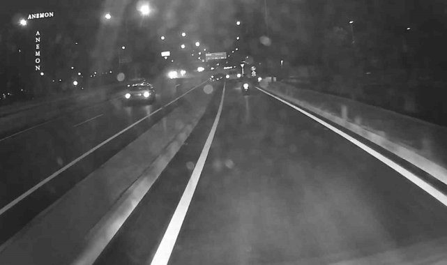 Görüntülerde hızla karşı şeride geçen otomobilin panelvan minibüs ile motosikletliye çarptığı, sürücünün yaşadığı şok anları yer aldı.