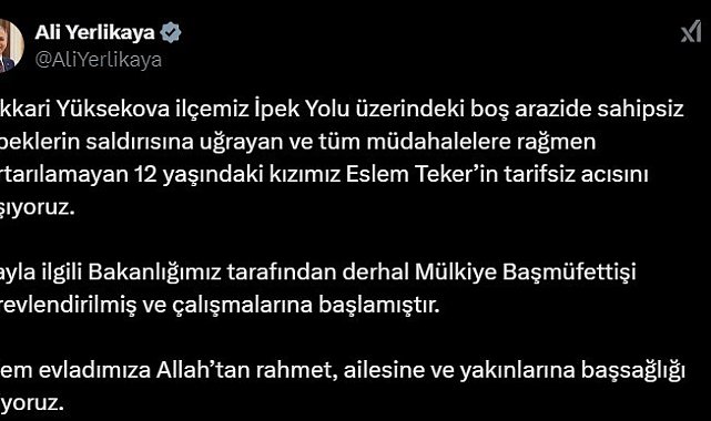 İçişleri Bakanı Ali Yerlikaya, Hakkari'nin Yüksekova ilçesinde sahipsiz sokak köpekleri tarafından saldırıya uğrayarak öldürülen 12 yaşındaki Eslem Teker için Mülkiye Başmüfettişi görevlendirildiğini açıkladı.
