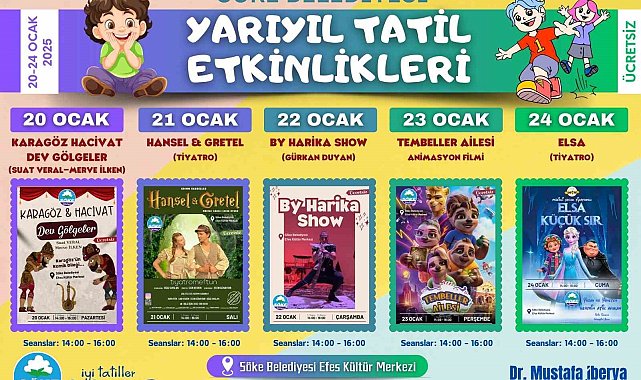 Söke Belediyesi, çocuklara yarıyıl tatilinde keyifli anlar yaşatacak bir etkinlik takvimi hazırladı. Söke Belediye Başkanı Dr. Mustafa İberya Arıkan'ın öğrencilere armağanı olarak düzenlenen bu etkinlikler, 20-24 Ocak 2025 tarihleri arasında Söke Belediyesi Efes Kültür Merkezi'nde gerçekleşecek.Tüm öğrencilere açık ve ücretsiz olarak sunulacak etkinlikler, her gün iki seans halinde saat 14.00 ve 16.00'da izleyicilerle buluşacak. Çocuklara keyifli bir yarıyıl tatili yaşatmayı hedefleyen etkinlik takvimi renkli gösterilere ev sahipliği yapacak. 20 Ocak Pazartesi Hacivat Karagöz Dev Gölgeler Gölge Oyunu, 21 Ocak Salı Hansel ve Gretel Tiyatro Gösterisi, 22 Ocak Çarşamba By Harika Şov, 23 Ocak Perşembe Tembeller Ailesi Animasyon Filmi, 24 Ocak Cuma Elsa Tiyatro Gösterisi çocuklarla buluşacak.Söke Belediye Başkanı Dr. Mustafa İberya Arıkan, etkinliklerin çocuklar için eğlenceli bir deneyim olmasını dilediklerini belirtti. Söke Belediyesi Kültür etkinlikleri kapsamında gerçekleşecek programa tüm öğrenciler davet edildi.