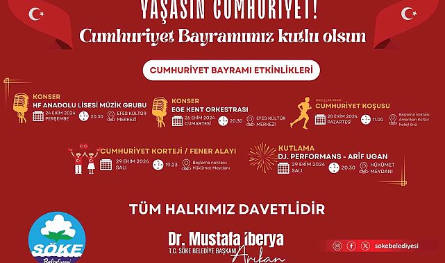 Cumhuriyet Bayramı'nın 101. yıldönümü Söke'de çeşitli etkinliklerle kutlanacak. Söke Belediyesi tarafından düzenlenecek etkinliklerde; konserler, cumhuriyet koşusu, cumhuriyet yürüyüşü ve fener alayı ile birlikte DJ performansın yer alacağı bir de kutlama etkinliği gerçekleştirilecek.Cumhuriyet Bayramı etkinlikleri kapsamında ilk olarak 24 Ekim 2024 Perşembe günü Söke Hilmi Fırat Anadolu Lisesi Müzik Grubu Efes Kültür Merkezi'nde konser verecek. Konser saat 20.30'da başlayacak. 26 Ekim 2024 Cumartesi günü Söke'nin efsane müzisyenlerinin bir araya geldiği Ege Kent Orkestrası, müzikseverlerle buluşacak. Ağırlıklı olarak 90'lı yılların şarkılarından oluşan repertuvarlarıyla dikkat çeken Ege Kent Orkestrası'nın konseri Efes Kültür Merkezi'nde saat 20.30 da başlayacak.28 Ekim Pazartesi günü okullar arası Cumhuriyet Koşusu yapılacak. Koşu saat 11.00'de Kuşadası yolu üzerindeki özel bir okul önünden başlayacak ve hükümet meydanında son bulacak. 29 Ekim 2024 Salı günü cumhuriyet korteji ve fener alayı yürüyüşü gerçekleştirilecek. Ellerde bayraklarla yapılacak yürüyüş 19.23 saatinde hükümet meydanından başlayacak. ardından Cumhuriyet Bayramı kutlaması gerçekleştirilecek. DJ Arif Ugan'ın sahne alacağı kutlama etkinliği, Cumhuriyet Bayramı coşkusuna coşku katacak.
