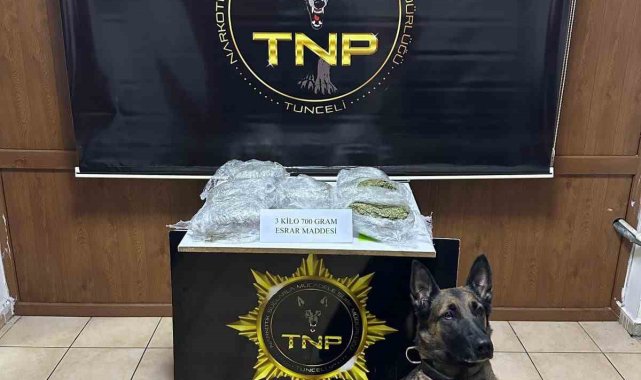 Tunceli'de polis ekipleri tarafından yapılan çalışmada bir araçta narkotik köpeği Luna ile yapılan aramada, aracın stepnesine gizlenmiş 3 kilo 737 gram esrar maddesi ele geçilirken, 2 şüpheli gözaltına alındı.Tunceli Emniyet Müdürlüğü İstihbarat ve Narkotik Şube Müdürlüklerince yapılan çalışmalar sonucu il dışından gelen bir araçta uyuşturucu madde olabileceği bilgisine ulaşıldı. Bunun üzerine Narkotik, KOM ve İstihbarat Şube Müdürlükleri zehir tacirlerine yönelik ortak bir operasyon gerçekleştirdi. Şüpheli araç takibe alınarak Pah Köprüsü üzerinde durduruldu. Narkotik madde arama köpeği Luna ile yapılan aramada araç bagajındaki yedek lastik içerisine zulalanmış vaziyette; 7 parça halinde toplamda 3 kilo 737 gram esrar maddesi ele geçirildi. Gözaltına alınan araç sürücüsü B.A. ve yanında bulunan A.Y.'nın işlemlerinin ardından adliyeye sevk edildiği bildirildi.