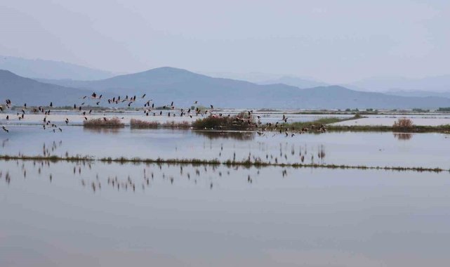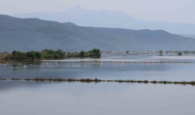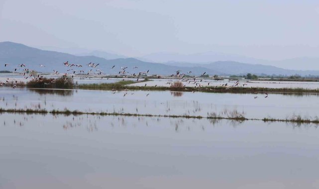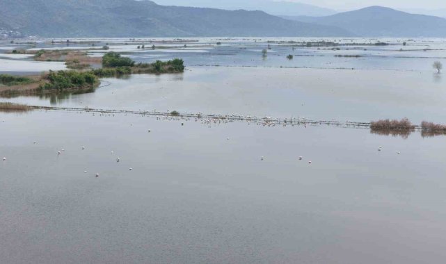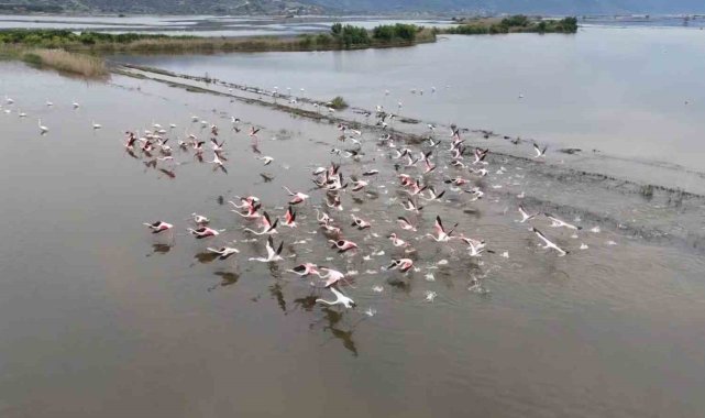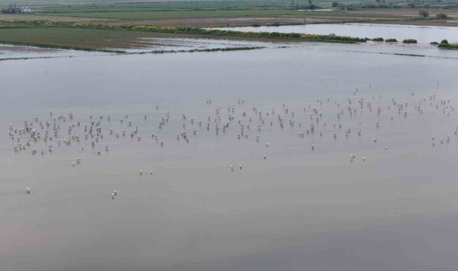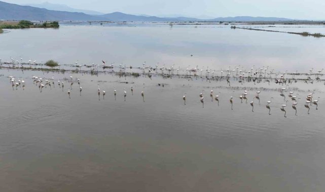 Su altında kalan arazilerde flamingolar görsel şölen oluşturdu