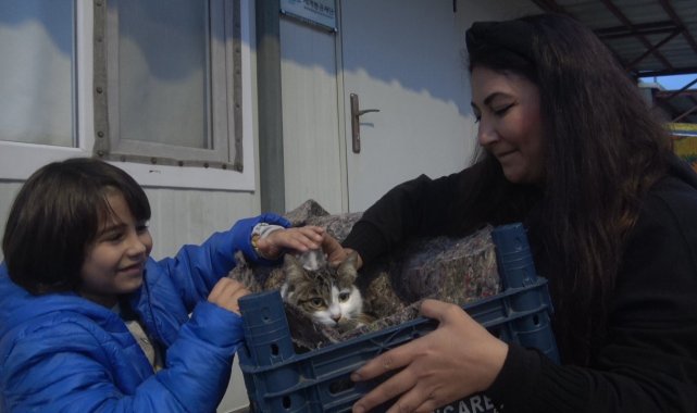 Su kanalında doğum yapan kedi ve 3 yavrusunun yeni yuvası depremzede ailenin konteyneri oldu