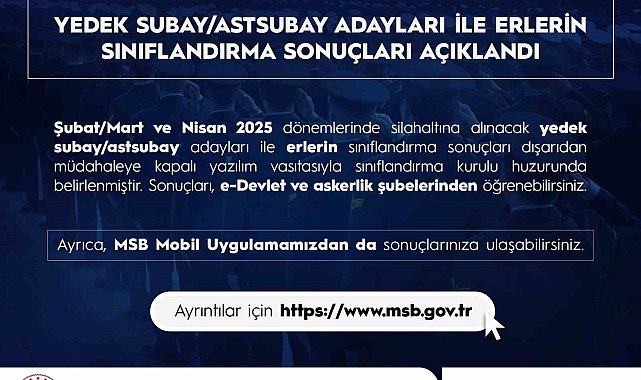 Şubat/Mart ve Nisan 2025 dönemlerinde silahaltına alınacak yedek subay/astsubay adayları ile erlerin sınıflandırma sonuçları dışarıdan müdahaleye kapalı yazılım vasıtasıyla belirlenerek, sonuçları e-Devlet'te açıklandı.