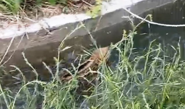 Sulama kanalına düşen domuz yavrusunun kanaldan çıkma mücadelesi kamerada