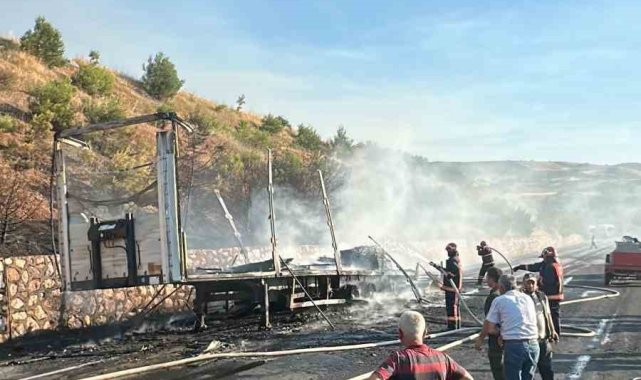 Bilecik'in Osmaneli ilçesinde sunta yüklü tırın dorsesi alev alev yandı.