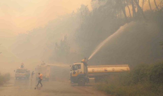 Suriye'nin Lazkiye ilinde çıkan orman yangınlarında itfaiye erleri alevlerin arasında kaldı.