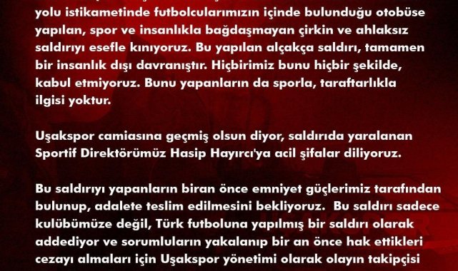 Nesine 3. Lig 2. Grup'ta mücadele eden Uşakspor otobüsüne deplasmanda yaptığı maçın ardından Balıkesir dönüşünde taşlı saldırı oldu. Saldırı sonrası bir Sportif Direktörü yaralandı.