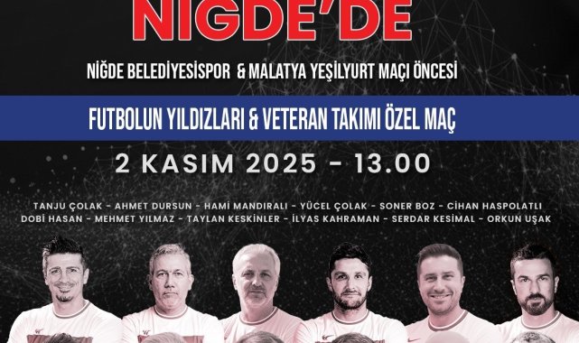 Niğde Belediyesi'nin ev sahipliğinde düzenlenecek Futbolun Yıldızları & Veteran Takımı Özel Maçında Türk futbolunun efsane isimleri Tanju Çolak ve Hami Mandıralı sahaya çıkacak.Niğde Belediyesi'nin ev sahipliğinde düzenlenecek "Futbolun Yıldızları & Veteran Takımı Özel Maçı" Türk futbolunun efsane isimlerini aynı sahada buluşturacak.Efsaneler yeşil sahadaSaat 13.00'te başlayacak özel karşılaşmada, futbolseverlerin gönlünde taht kurmuş yıldızlar forma giyecek.Avrupa Gol Kralı Tanju Çolak ve Türk futbolunun unutulmaz frikik ustası Hami Mandıralı başta olmak üzere, Ahmet Dursun, Yücel Çolak, Soner Boz, Cihan Haspolatlı, Dobi Hasan, Mehmet Yılmaz, Taylan Keskinler, İlyas Kahraman, Serdar Kesimal ve Orkun Uşak gibi birçok isim sahada olacak.Bir döneme damga vuran efsanelerin yeşil sahada sergileyecekleri performans, Niğdeli futbolseverlere nostaljik ve keyifli anlar yaşatacak.Başkan Özdemir'den spora tam destekNiğde Belediye Başkanı Emrah Özdemir'in spora desteği ile hayata geçirilen organizasyon, Niğde Belediyesi'nin spora ve sporcuya verdiği önemin de bir göstergesi. Etkinlik, genç nesillere spor sevgisini aşılarken, Niğde Belediyesi Spor'a olan desteği daha da güçlendirecek.Tüm Niğde halkının davetli olduğu etkinlikte, gösteri maçının hemen ardından saat 15.00'te Niğde Belediyesi Spor, Malatya Yeşilyurt karşısında kritik bir lig mücadelesine çıkacak.Niğde, 2 Kasım Pazar günü adeta bir futbol bayramı yaşayacak.