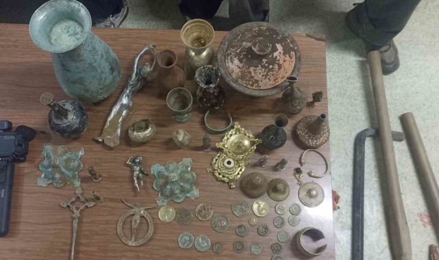 Bursa'nın Orhaneli ilçesinde kaçak kazı yapan 3 şüpheli polis ekiplerinin düzenlediği baskında yakalandı. Yapılan aramada sikke, heykel ve çok sayıda tarihi eser ele geçirildi.Bursa'nın Orhaneli ilçesi Kurtoğlu mevkiinde kaçak kazı yapıp tarihi eserleri kaçıran 3 şüphelinin bilgisi alan Orhaneli İlçe Emniyet Müdürlüğü ekipleri, ihbar üzerine harekete geçti.Cumhuriyet Başsavcılığı'ndan izin alan ekipler, tarihi eser kaçakçılarına düzenlediği baskında suçüstü yakaladı. Şüphelilerin üzerinde kazı ve tarihi eserleri bulmak için el dedektörü, kazma, kürek, levye, kamera ve alan tarama makinesi geçirildi. Alanda yapılan aramada ise, tarihi eser olduğu değerlendirilen, sikke paralar, heykeller ve yaklaşık 50 parça çeşitli eserler bulundu. Malzemelere el konulurken, 3 şüpheli ifadelerinin ardından adliyeye sevk edilecek.