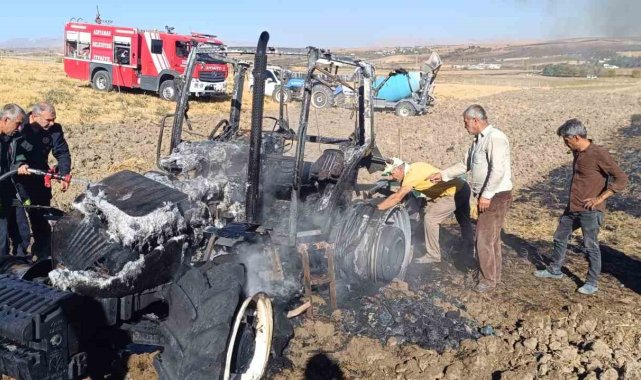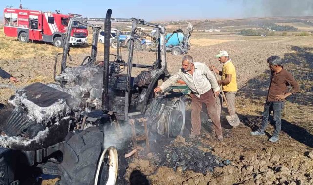 Adıyaman'da, tarlayı süren traktör alev alarak yandı.