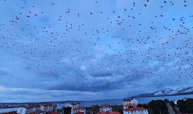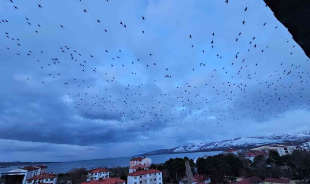 BİTLİS (İHA) – Bitlis'in Tatvan ilçesinde akşam saatlerine doğru gökyüzünde beliren binlerce sığırcık, izleyenlere görsel şölen sundu.