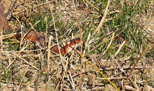 Bitlis'in Tatvan ilçesine bağlı İncekaya köyü kırsalında gezintiye çıkan doğa gezgini Rıdvan Bütün, nadir görülen kırmızı yılan (Dolicophis schmidti) görüntüledi.