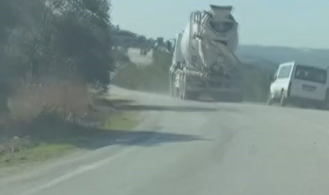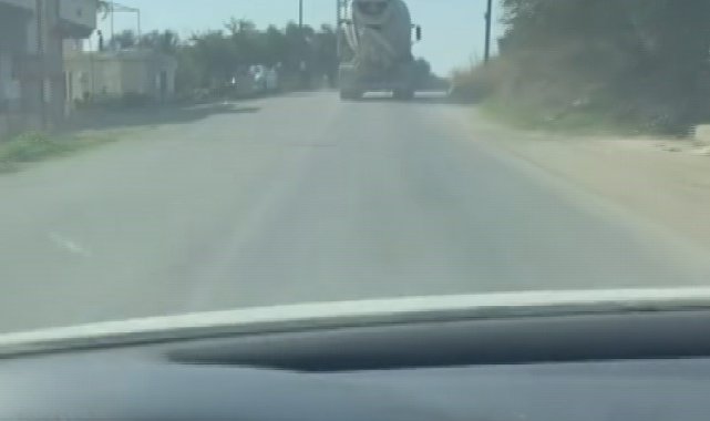 Hatay'ın Altınözü ilçesinde tek şeritli yolda 100 kilometreyi bulan hızıyla ilerleyen mikser sürücüsü başka bir araç sürücüsü tarafından görüntülendi.