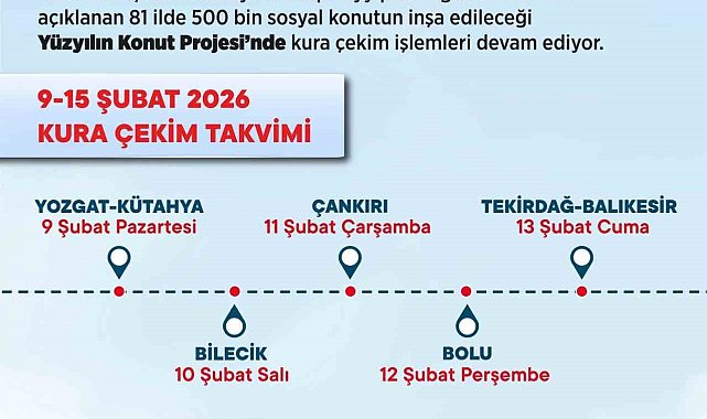 Bakanlık takvimine göre, 9-15 Şubat 2026 haftasında 7 ilde toplam 25 bin 985 sosyal konutun daha kurası çekilecek. Bu kapsamda 13 Şubat Cuma günü Tekirdağ'da 6 bin 865, Balıkesir'de ise 7 bin 548 konutun hak sahipleri belirlenecek. Kura çekimlerinin tamamlanmasıyla birlikte, 15 Şubat itibarıyla kura yapılan il sayısı 57'ye, hak sahibi belirlenen toplam konut sayısı ise 203 bin 111'e ulaşacak.