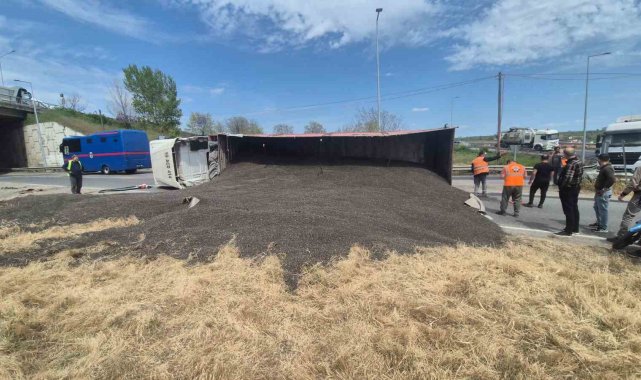Tekirdağ'ın Süleymanpaşa ilçesinde ayçiçeği çekirdeği yüklü tırın devrilmesi sonucu tonlarca ürün yola savrulurken trafik bir süre tek şeritten sağlandı.