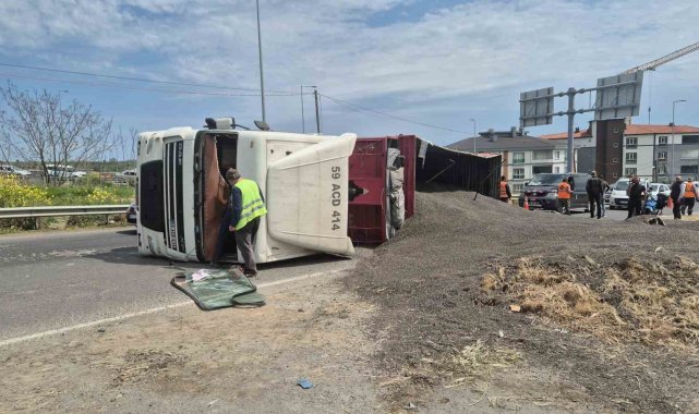 Tekirdağ'da ayçiçeği çekirdeği yüklü tır devrildi, trafik kilitlendi