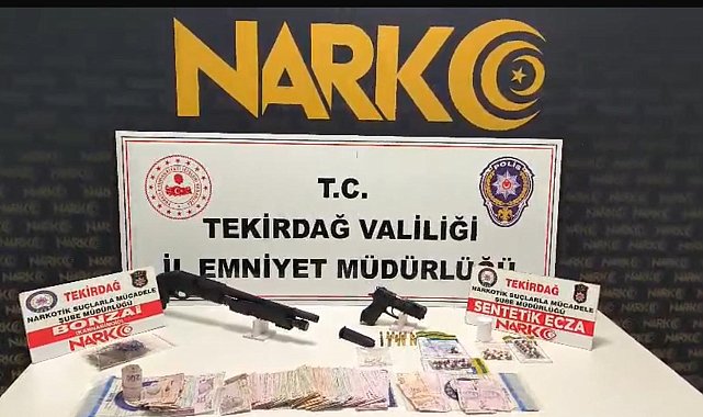 Tekirdağ'da polis ekiplerinin Aydoğdu ve Karadeniz Mahallelerinde düzenlediği eş zamanlı operasyonlarda uyuşturucu madde ve silah ele geçirilirken, 10 kişi tutuklandı.Tekirdağ İl Emniyet Müdürlüğü Narkotik Suçlarla Mücadele Şube Müdürlüğü ekipleri, uyuşturucu satıcılarına yönelik yürüttükleri çalışmalar kapsamında Aydoğdu ve Karadeniz Mahallelerinde belirlenen 8 ayrı adrese eş zamanlı operasyon düzenledi. Operasyonlarda piyasa değeri yaklaşık 55 bin TL olan uyuşturucu hap ve uyuşturucu madde, 46 bin 995 Tl para, 1 adet ruhsatsız tüfek, 1 adet ruhsatsız tabanca ve 17 adet tabanca fişeği ele geçirildi.Yapılan operasyonda gözaltına alınan 11 şüpheliden 10'u çıkarıldıkları mahkemece tutuklanarak cezaevine gönderildi.Tekirdağ İl Emniyet Müdürlüğü, kentte uyuşturucu satıcılarına yönelik operasyonların aralıksız süreceğini bildirdi.
